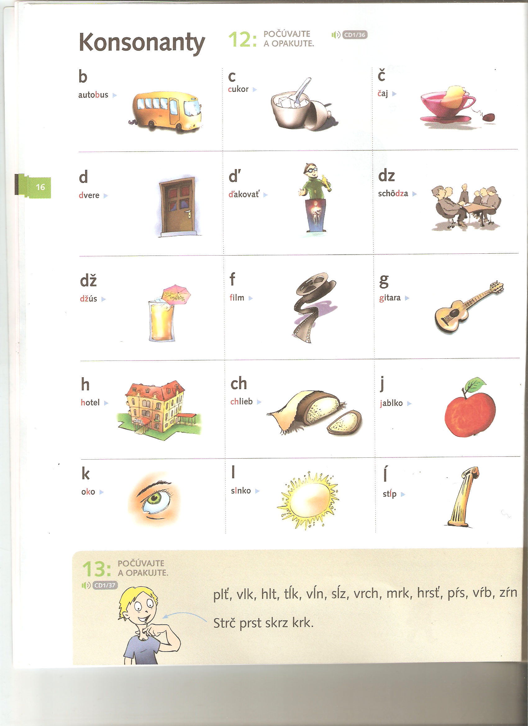 autobus=bus cukor=sugar čaj=tea dvere=door ďakovať= thank schôdzka=meeting džús=juice film=movie gitara=guitar hotel=hotel chlieb= bread jablko=apple oko=eye slnko=sun stĺp=column